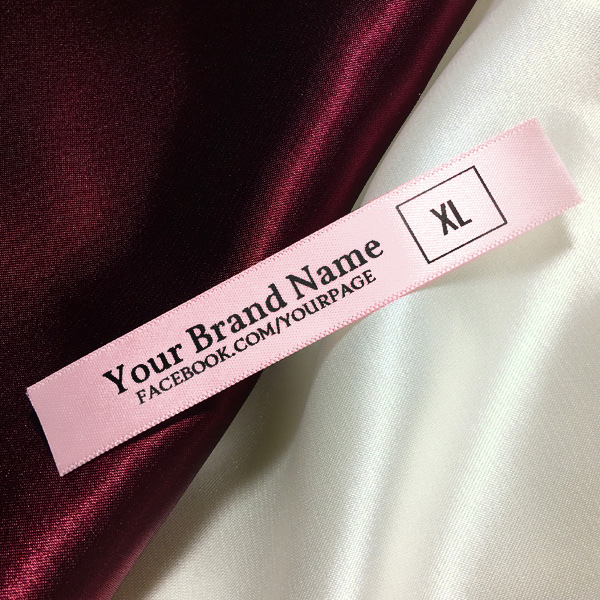 Benutzerdefiniertes Etikett TL-M22 gedruckt auf satiniertem Textil, geeignet für Kleidung und verschiedene Kleidungsstücke.