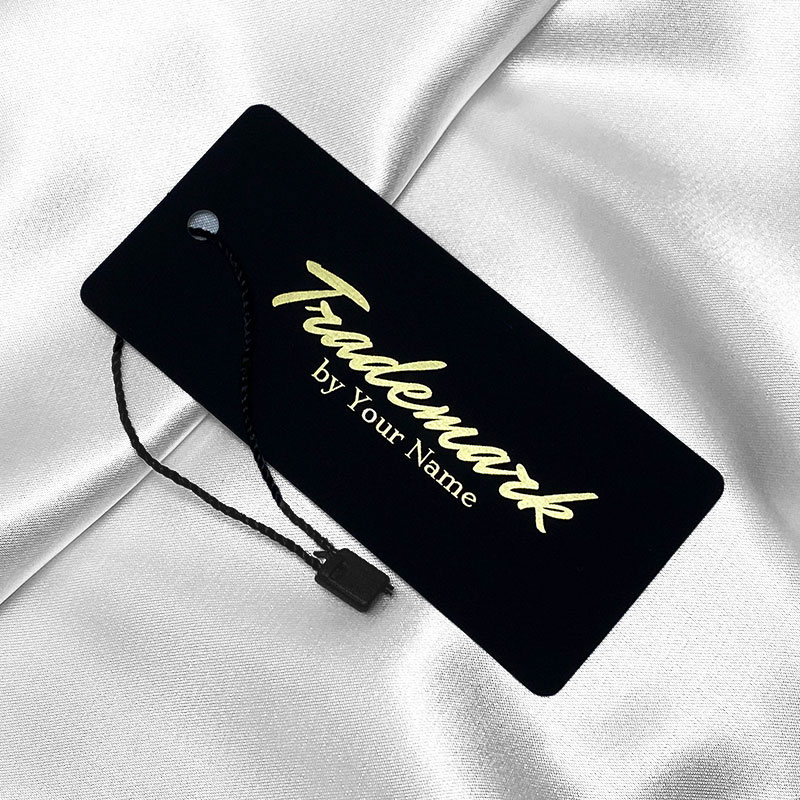 Etikett zum Aufhängen an Kleidung vom Typ Tag, auf Bestellung aus schwarzem Karton mit Text oder personalisiertem Logo, gedruckt durch Thermotransfer mit Goldenes Folio. Dieses Modelletikett besteht aus hochwertigen Materialien und wird mit den modernsten Technologien im Bereich Digitaldruck und Weiterverarbeitung hergestellt.