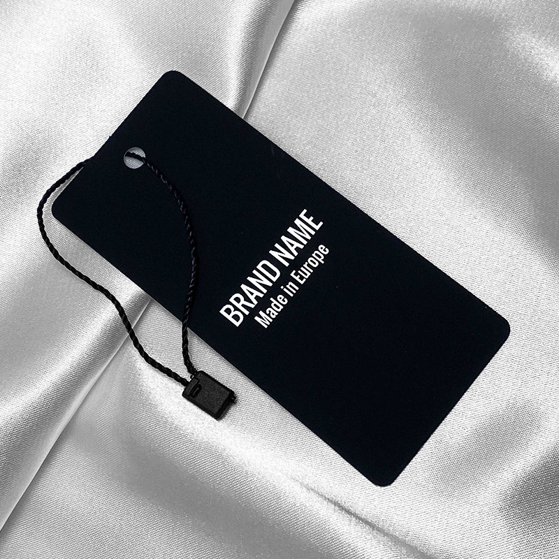 Elegantes Kleideretikett mit Aufhängekordel, aus schwarzem Karton, personalisiert mit silbernem Text oder Logo. Dieses Modelletikett besteht aus hochwertigen Materialien und wird mit den modernsten Technologien im Bereich Digitaldruck und Weiterverarbeitung hergestellt.