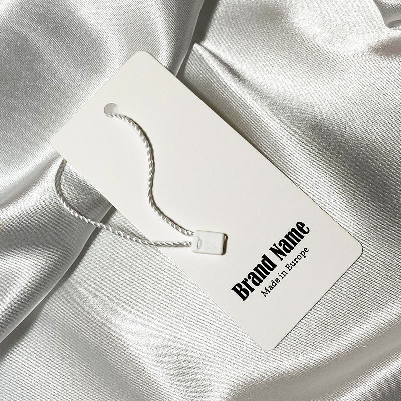 Personalisiertes Kartonetikett mit Kordel passend für Kleidung, Schuhe, Schmuck und verschiedene Bekleidungsaccessoires, bedruckt mit Markenname und Logo. Dieses Modelletikett besteht aus hochwertigen Materialien und wird mit den modernsten Technologien im Bereich Digitaldruck und Weiterverarbeitung hergestellt.