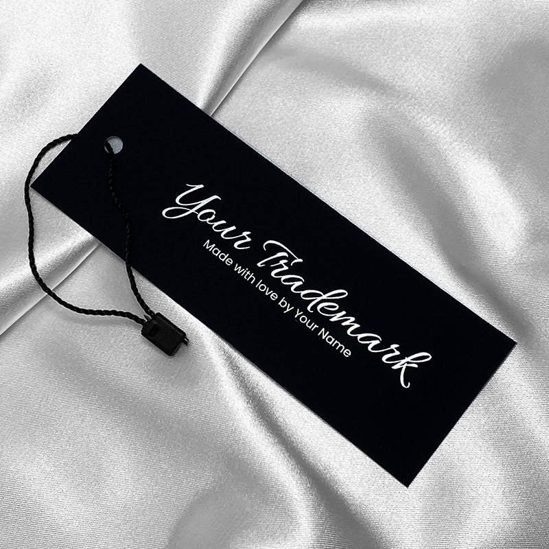Personalisiertes Kartonetikett HT-M118 für Textilprodukte wie Damenbekleidung, Herrenbekleidung und Bekleidungszubehöre.