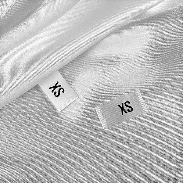 Textiletiketten mit der Größe oder Nummer des zu bestickenden Produkts, aus weißem Satin mit schwarzer Schrift bedruckt. Dieses Modell eines Textiletiketts wird mit den modernsten Technologien im Bereich des Digitaldrucks auf Textilmedien hergestellt. Die Etiketten werden im Thermotransfer-Verfahren auf Spezialsatin gedruckt, das sich durch eine beeindruckende Druckqualität und hohe Waschbeständigkeit auszeichnet. Die gedruckten Etiketten werden automatisch entsprechend den angegebenen Maßen geschnitten.