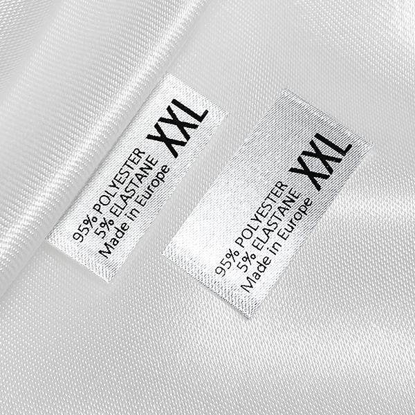 Wäsche-Etiketten, individualisiert mit der Größe, den Herstellerangaben und der Materialart, zum Aufnähen auf Kleidung oder diverse Kleidungsstücke. Dieses Modell eines Textiletiketts wird mit den modernsten Technologien im Bereich des Digitaldrucks auf Textilmedien hergestellt. Die Etiketten werden im Thermotransfer-Verfahren auf Spezialsatin gedruckt, das sich durch eine beeindruckende Druckqualität und hohe Waschbeständigkeit auszeichnet. Die gedruckten Etiketten werden automatisch entsprechend den angegebenen Maßen geschnitten.